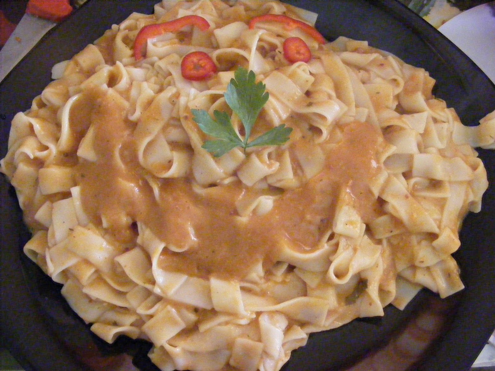 Se calesc ceapa si ardeiul in ulei, cand s-au inmuiat se aduaga carnea, se lasa cu capac sa se inabuse impreuna, se adauga sare, se adauga pasta de rosii sau ketcup-ul, cimbrul si foile de dafin si se lasa sa fiarba inabusit cu capac. La sfarsit se adauga piperul. Daca e nevoie se adauga apa cat sa acopere. Se lasa sa fiarba pana e fiarta bine carnea. Intre timp se fierb pastele, pot fi spaghete sau lasti, dupa preferinte, in apa cu sare si putin ulei. La sfarsit se strecoara pastele si se adauga sosul peste paste. Se servesc calde.